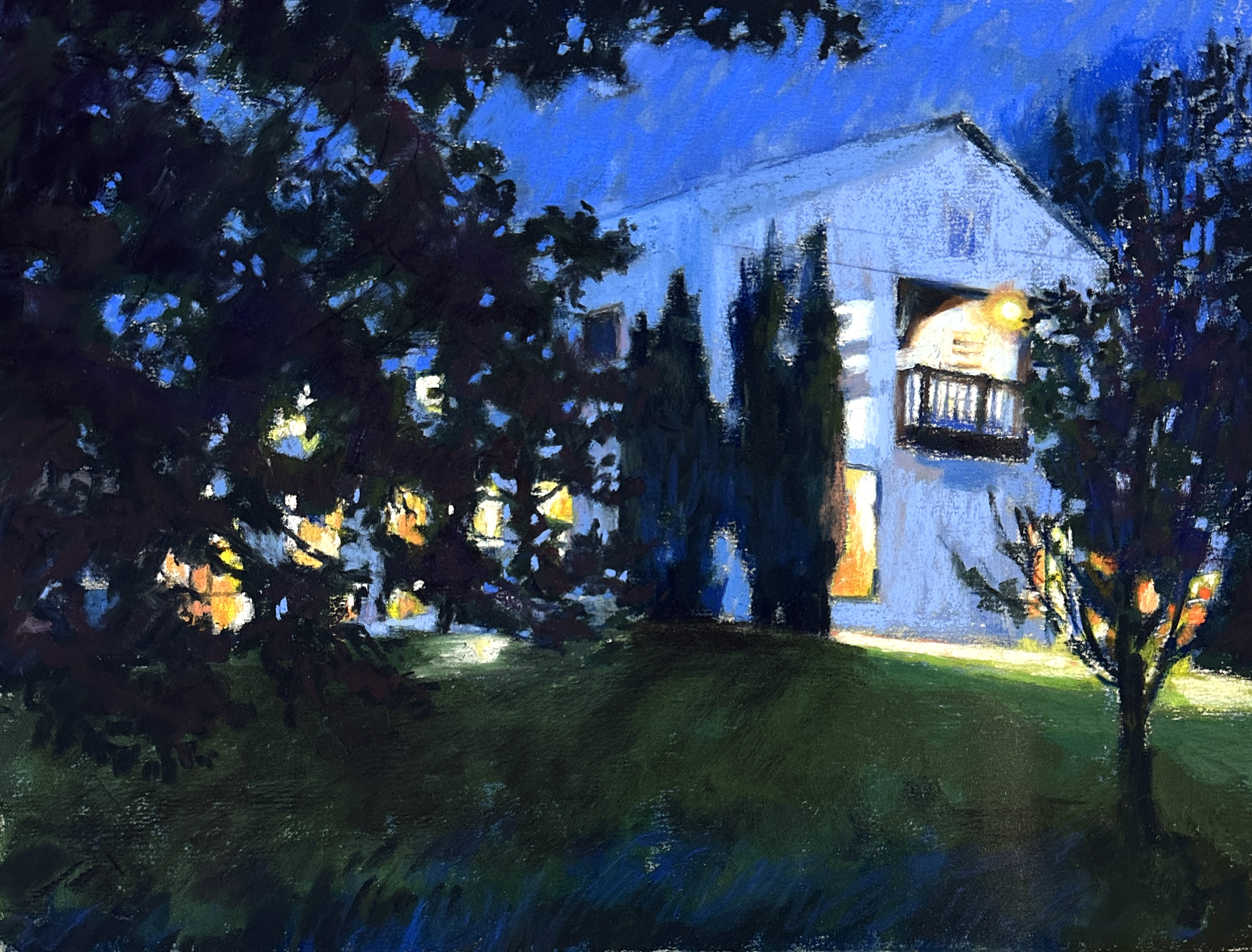 For this reason, I love the above image of St. Joseph’s at Mt. Saviour by made by Ingrid Van Slyke (Orein ‘24). The light of the guest house looks like flames of the Holy Spirit flickering out of the windows. When the world is burning (when isn’t it) this painting gives a sense of what might be happening in the heart of many who come to Mt. Saviour.︎